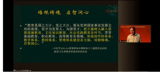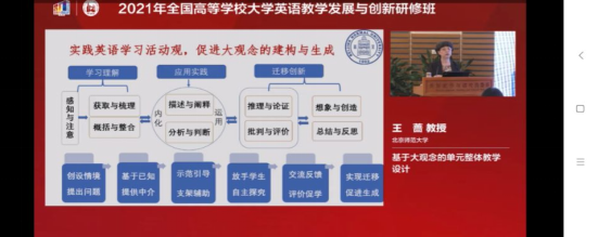 下午的专题报告在北京师范大学王蔷教授的“基于大观念的单元整体教学设计”中拉开了帷幕,王教授从大观念提出的背景出发,讲述了大观念是什么,单元整体教学是什么,并通过具体案例讲述了大观念+单元整体教学该如何做。西南交通大学李成坚教授的“课程思政维度下的外语课程设计和思政方法”主旨报告向我们讲述了外语课程思政的内涵和路径,并以《西方现代化视野下的英美文学》课程为例展现了课程的设计和教材编写。西安电子科技大学曹志宏副教授从课程思政的提出和内涵、大学英语课程思政线上线下混合式智慧教学设计、《新视野(第三版)思政智慧教学范例》和今后努力的方向四个方面讲述了“立德树人,同心同行─大学英语课程思政智慧教学改革与实践”。研修班在外语教学与研究出版社的“优质资源服务有效教学,秉持初心推动人才发展”的主旨报告中圆满结束。