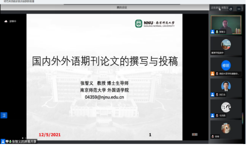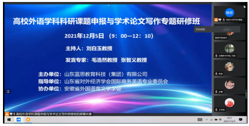 2021年12月5号上午9:00---12:00,师范英语教研室组织全体教师在线参加了高校外语学科课题申报与学术论文写作专题研修班培训。中国石油大学外国语学院院长毛浩然教授和南京师范大学张智义教授作为发言专家分别在线讲授了国家社科项目课题申报的技巧和国内外外语核心期刊论文撰写与发表的途径和方法。