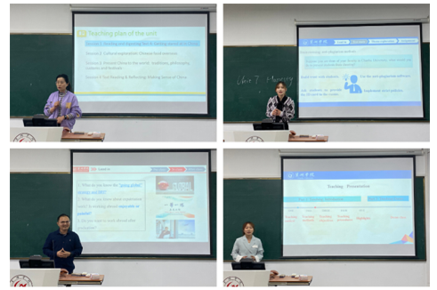 首先进行教学展示的是程艳,她讲授的课题是“Getting Stared at in China”。通过课前活动引出文化敏感度的话题和练习,再导入到教学主题---文化敏感度。然后结合课本内容,从定义和不同的文化案例,总结了文化敏感度的概念和内涵,分析了文化交流中容易产生的误解,引导和帮助学生如何成为有效的跨文化交际者。黄洁茹讲授的课题是“when honesty disappears”。首先通过图片展示的方式向学生介绍了不诚信现象,引导学生开展对不诚信行为的思考,随后结合课文内容,分析课文中的校园不诚信行为及其产生原因,通过情景模拟让学生思考如何应对抄袭、作弊等不诚信行为,并结合课文内容讲述了中国文化中的诚信故事,了解中国守信为先的实例,并分析诚信为本的重要性,引导学生树立诚信意识,增强诚信品质。李成飞讲授的主题是“Working abroad and expatriate adjustment”,通过介绍中国“走出去”以及“一带一路倡议”,结合自己的企业工作经历以及对中企外派员工的实证调查,讲述了今天中企遍及全球的现象。引导学生学习了解企业外派,文化以及文化濡化的概念。中企外派员工的动机,展现了中企外派员工的激情与梦想,鼓励学生今后选择从事外派事业,服务中企,服务国家“走出去”以及“一带一路”倡议。马曼华讲授的课题是“Speaking Chinese in America”。通过图片讨论引出刻板印象的话题及刻板印象的定义。通过文本分析引出刻板印象产生的主要原因—文化差异,进而提出我们需要通过讲好中国故事来破除跨文化交际中由文化差异带来的刻板印象。鼓励学生成为一个可以说好中国故事的人,在世界舞台传递中国声音。
