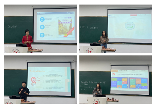 王珊珊讲授的课题是“Opportunity Cost”,通过上大学的成本引出机会成本的概念,帮助学生区分日常生活中的成本概念和机会成本的差异。然后引导学生思考疫情防控政策的成本,帮助学生明辨是非,理解中国决策的根本:人民利益高于一切。王友情讲授的课题是“Nature: To worship or to conquer”。首先,通过引用古希腊哲学家的名言,让学生思考讨论人与自然之间的关系,锻炼学生的独立思考能力和思辨能力。以文本为依托,通过课堂展示,挖掘人与自然关系的主题内涵。帮助学生正确认识人与自然的关系,培养学生的可持续发展的环保理念。张丹讲授的课题是“generation gap”。通过视频引出代沟的话题,再导入到解决代沟的方式方法——harmony。然后结合课本内容,通过阅读理解任务、口语活动等引导和帮助学生通过沟通来消除代沟,从而达到代际间的和谐。赵雅芸讲授的课题是Beauty: When the other dancer is the Self。通过视频导入到课程主题——如何对待逆境。整节课由三个问题贯穿始终,再通过五个互动活动,让学生在学习中树立面对困境的勇气。