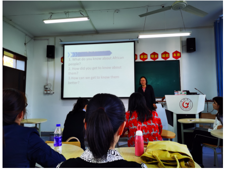 汇报以课程思政教学公开课的形式开始,王娟选取《新视野第三版读写教程》第四册第五单元中的课文“Speaking Chinese in America”一课为教学内容,选取刻板印象(stereotype)为重点和突破点,介绍了刻板印象的概念、产生的原因。以刻板印象为主线设计教学环节,包括头脑风暴找出文中提到的美国人对中国人和汉语的刻板印象、讨论对他人的刻板印象以及如何打破刻板印象和根据课文内容进行的角色扮演。其中如何打破刻板印象部分采用了对中国古代和现当代名人名言进行翻译方式,有效升华了主题。