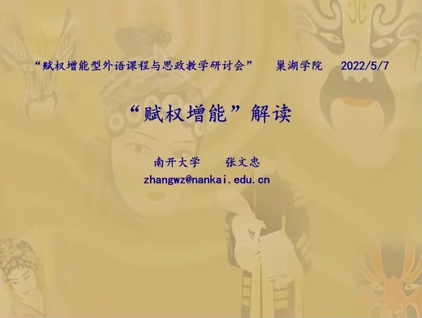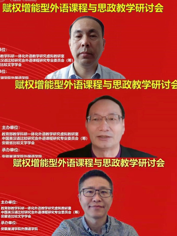 为进一步深化赋权增能型外语教学理念在外语教科研中的运用,提升外语课程思政的建设,提高新时代外语教学和人才培养质量,5月7日,教育部教学科研一体化外语教学研究虚拟教研室、中国英汉语比较研究会外语课程研究专业委员会(筹)、安徽省比较文学学会联合主办了全国赋权增能型外语课程与思政教学研讨会(线上会议)。会议由awc777万象城娱乐官网外国语学院承办。