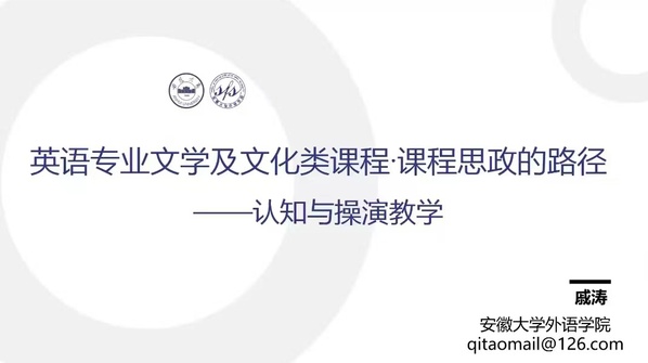 接着,戚涛教授从思什么政、如何思政、思政的度等三个方面,探讨了“英语专业文学及文化类课程·课程思政的路径”。他认为要从全球局势和中美博弈等高度看待课程思政的重要性,应遵循从价值认知和传递的规律,用认知和操演的方法进行思政设计和教学,将马克思主义思维方式、中国文化认同与自信、社会主义核心价值观,以及其他先进、美好的价值理念全程、深度融合到课程内外。