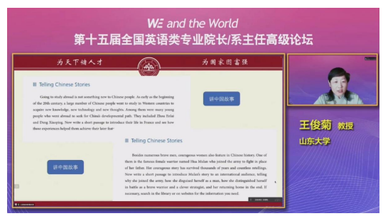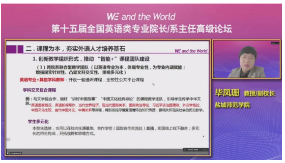 15日上午,大会共进行了8场专题报告。湖南师范大学曾艳钰教授做了题为“新文科背景下英语类国家一流专业内涵建设”的主旨报告,详细阐述英语的学科化专业建设。北京外国语大学张剑教授做了题为“学科内涵建设与专业优化”的主旨报告,进一步阐述学科内涵建设和专业优化的内在联系。盐城师范学院毕凤珊教授做了题为“课程提质与培养模式创新”的报告,分享了课程提质和培养模式创新的原则和具体方法。