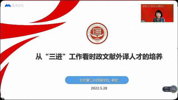 在“课程育人”主题讨论环节中,程维教授在《从“三进”工作看时政文献外译的人才培养》的主旨报告中,从“三进”对于翻译人才培养的意义、时政文献外译的“三个意识”、课程体系对人才培养的意义三个方面讨论了如何培养时政文献外译人才。