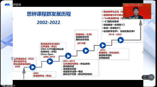 陈向京教授在题为《依托一流课程群的英语思辨能力培养模式创新与实践》的主旨报告中,围绕思辨能力培养,从建设历程、体系构建、课程建设和团队建设四个方面介绍了课程团队长达20年的团队建设实践经验,将思辨能力与国际传播能力培养相结合,为其它高校提供了借鉴。