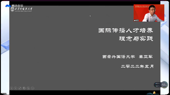 姜亚军教授在《国际传播人才培养与课程思政教学》的主旨报告中,回顾了中国外语教育有关人才培养的相关文件,接着结合西安外国语大学国际传播人才培养实践,介绍了西安外国语大学卓越人才培养模式以及该模式下的课程设置与课程建设,最后从中美文化比较案例入手,展示了具体课程教学是如何将理想信念、社会主义价值观以及外语素养的培养和学生的政治思辨能力培养有机且自然融合。