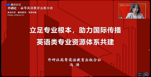 外研社高等英语教育出版社冯涛副社长在《立足专业根本,助力国际传播--英语类专业资源体系共建》的主旨报告中,从英语专业的资源建设层面,介绍了外研社如何以满足多样化人才创新发展、对标新文科的要求为方向,整合各类资源,从而助力国际传播人才的培养。