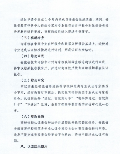 结论审定。评估中心将审议结果报教育部教师工作司同意后,提交教育部认证专家委员会审定。认证结论分为“通过,有效期6年”“有条件通过,有效期6年”“不通过”三种。认证结论适时公布。