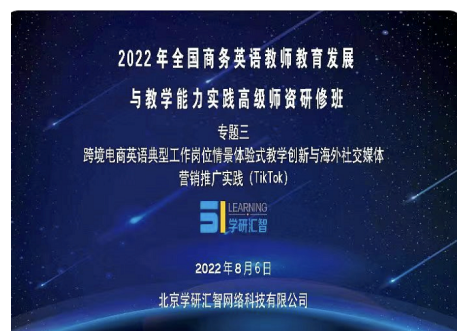 2022年8月6日,商务英语教研室组织全体教师参加全国商务英语教师教育发展与教学能力实践高级师资研修班学习。本次学习的主题是跨境电商英语典型工作岗位情景体验式教学创新与海外社交媒体营销推广实践。