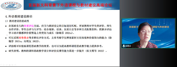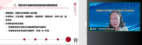 第三位发言的是华东师范大学思勉人文高等研究院院长袁筱一教授,她作了题为“新文科、课程思政与外语教材建设的新理念”的主旨报告,阐述了课程思政、新文科与外语教材的更新迭代,以及现阶段外语教材面临的问题与挑战。