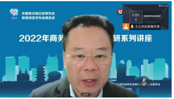 10月14日,中国英汉语比较研究会教育语言学专业委员联合华东师范大学出版社召开的2022年商务英语教学与科研学术系列讲座第一场讲座在线上举行。北京语言大学王立非教授的讲座主题为“新文科指引下的复合型商务英语专业建设与人才培养”,商务英语教研室全体教师聆听了线上讲座。