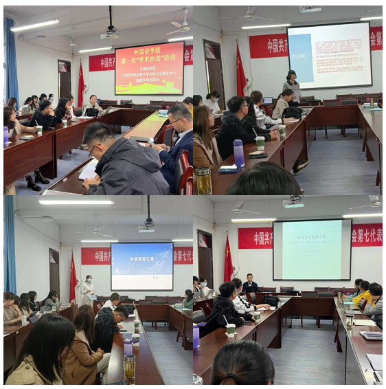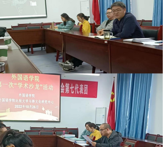 10月26日下午,外国语学院在明德楼404会议室举办了第一期“学术沙龙”活动。此次活动由学院比较文学与跨文化研究中心召集,活动的主题为“学习贯彻党的二十大精神,推进外语学科有组织科研”。学院院长余荣琦、党委副书记李磊、副院长余鹏出席活动,各科研中心负责人、比较文学与跨文化研究中心全体成员以及部分青年教师代表参加了此次学术沙龙活动。活动主要包括党的二十大精神学习、科研平台工作计划汇报、科研项目选题汇报、点评与交流、活动总结等五项议程。本次学术沙龙活动由外国语学院副院长、比较文学与跨文化研究中心负责人余鹏主持。