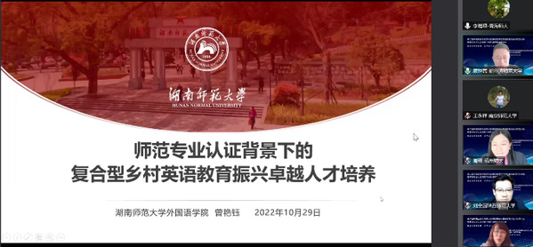 湖南师范大学曾艳钰教授作了题为“师范专业认证背景下的复合型乡村英语教育振兴卓越人才培养”的报告,围绕英语教育如何更好的服务国家乡村振兴战略需求和乡村基础教育发展问题,介绍了湖南师范大学“中外合作、校地融合、问题导向”的新人才培养模式。