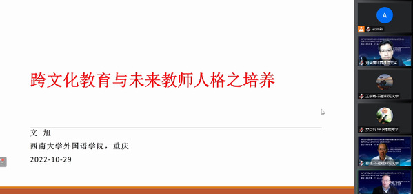 西南大学外国语学院文旭教授作了题为“跨文化教育与未来教师人格之培养”的报告,从跨文化角度介绍了师范生综合素质的提升路径。