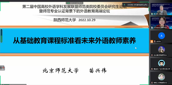 10月29日-30日,师范英语教研室组织全体教师线上观看“第二届中国高校外语学科发展联盟师范类院校委员会研究生论坛暨师范专业认证背景下的外语教育高端论坛”,本次论坛由中国高校外语学科发展联盟师范类院校委员会主办、陕西师范大学外国语学院承办的。开幕式上,陕西师范大学副校长李磊副研究员、外国语学院院长刘全国及中国高校外语学科发展联盟师范类院校委员会主任、北京师范大学外文学院院长苗兴伟教授分别致辞。