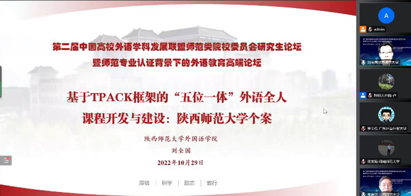 最后,陕西师范大学刘全国教授作了题为“基于TPACK框架的五位一体外语全人课程开发与建设:陕西师范大学的个案”的报告,通过介绍陕西师范大学的具体做法,以点破面,分析了“五位一体”的育人理念和培养目标。