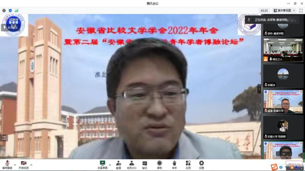 2022年11月4-6日,安徽省比较文学学会2022年年会暨第二届“安徽省比较文学青年学者博融论坛”于线上召开。此次会议由安徽省比较文学学会主办,淮北师范大学外国语学院、淮北师范大学国别与区域研究中心承办,外语教学与研究出版社协办。外国语学院院长余荣琦、副院长余鹏、谷峰、李成飞、李吟、马曼华等应邀参会。