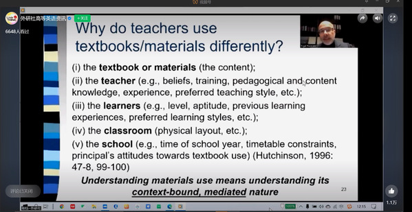 谢菲尔德大学教授奈杰尔·哈伍德(Nigel Harwood ) 就外语教材发展分享研究成果,指出应关注教材内容, 教材使用,教材编写。具体阐述了教材内容指的是教材应该包括和不包括的主题,语言信息,文化;教材使用包括探讨教师和学习者如何在课内课外使用教材;教材编写包括教材编写的规范和具体措施。