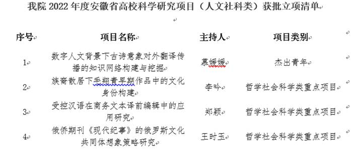 根据《安徽省教育厅关于组织编制2022年度高等学校科研计划的通知(皖教秘科〔2022〕146号)要求,经个人申报、部门推荐、学校外审、教育厅评审,外国语学院共有4项省高校科学研究项目获准立项:慕媛媛博士入选省级杰出青年科研项目(项目经费50万元),李吟、郑颖、王时玉等三位教师获批省教育厅哲学社会科学类重点项目。
