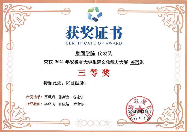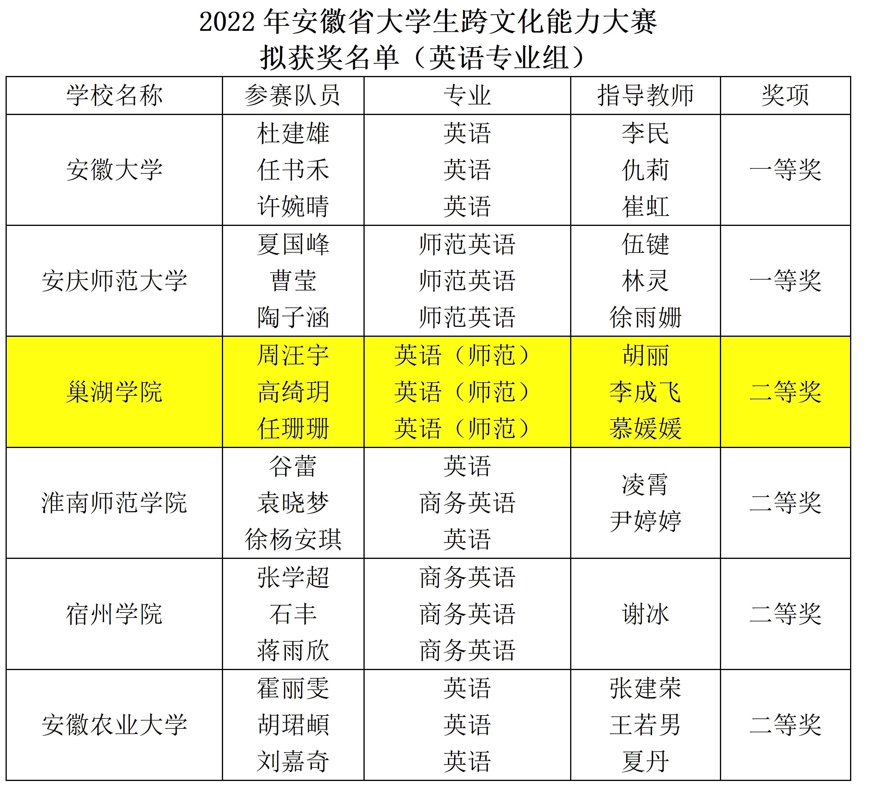 安徽省大学生跨文化能力大赛面向全省本科院校的B类赛事。2022年英语专业组共有29所本科院校参赛,18支参赛队伍晋级省赛决赛。参赛学校有安徽大学、合肥工业大学、安徽师范大学等综合类大学,也有合肥学院、黄山学院等应用型本科高校。大赛旨在落实立德树人根本任务,“以赛促教”全面推进《习近平谈治国理政》多语种版本“三进”工作,深化新时代外语教育改革和外语课程思政建设,“以赛促学”提升新时代大学生核心素养和综合外语能力,为讲好中国故事安徽篇章和“徽风皖韵”的外语诠释,培养更多具有家国情怀、全球视野和专业本领的复合型人才。