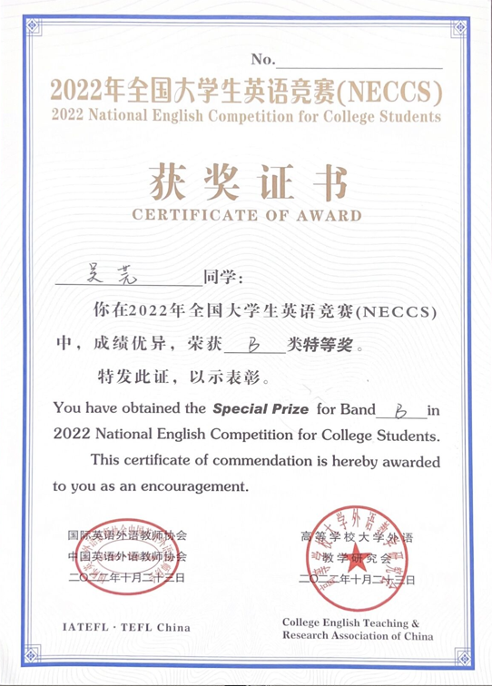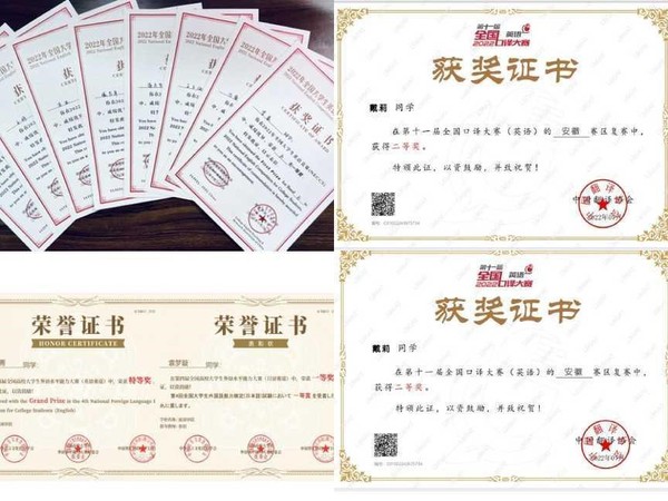 *在“外研社·国才杯”2022年度全国英语演讲、写作和阅读大赛安徽省决赛中共获得一等奖1项,二等奖2项,三等奖1项;