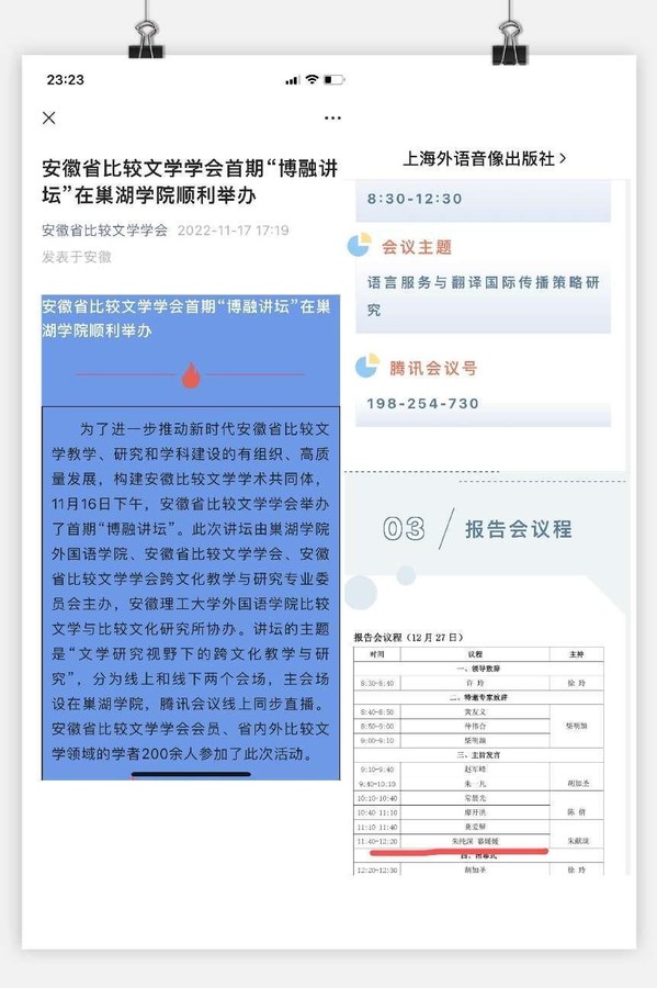 11月,安徽省比较文学学会官方微信公众号专题报道了由我院主办的“安徽省比较文学学会首期博融讲坛”活动,肯定了我院在联合省级学术平台,共建学术共同体方面的积极贡献。
