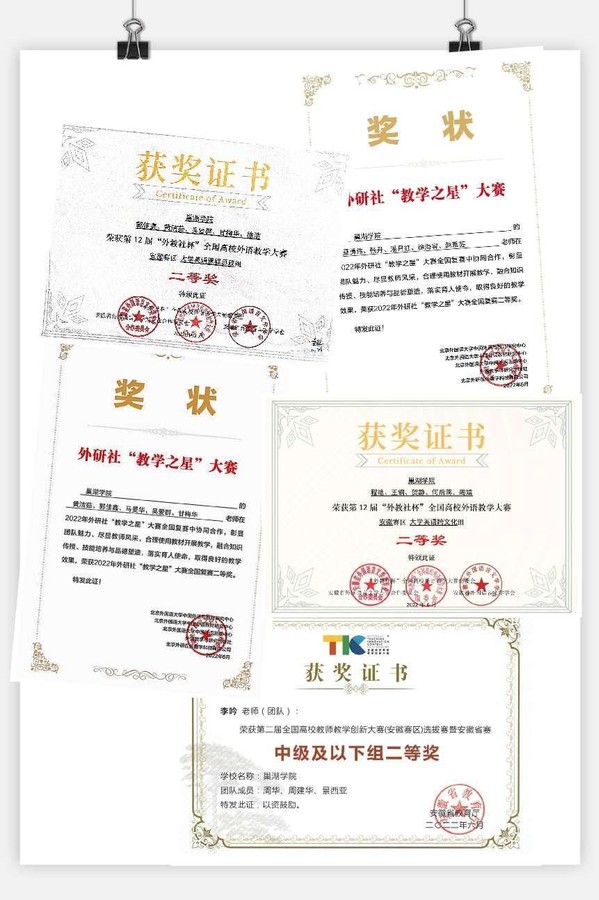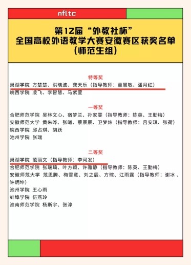 *在第12届“外教社杯”全国外语教学大赛安徽赛区(师范生组)中,获得特等奖1项和二等奖1项的优异成绩;