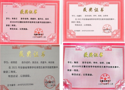 本年度,在备赛安徽省2022年高等学校师范生教学技能竞赛暨第四届长三角师范生教学基本功大赛选拔赛的过程中,经过层层选拔考验的参赛选手们以师兄师姐为榜样,学习他们的参赛经验,在优秀案例的基础上不断磨砺和创新,精益求精打磨参赛作品。通过本次竞赛和培训,参赛选手相互鼓励,共同成长,在比赛中发挥出了较好的水平,获得二等奖一项,三等奖一项。