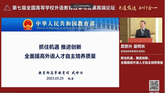 随后教育部高等教育司武世兴副司长表示,要以高等教育强国建设为目标,提高人才培养质量,推进高等教育改革,从课程改革出发到解决人才培养问题。他提到,外语教育应该从五个方面发力,一是创新推动外语教育课程思政建设,二是在“四新”建设中推进外语教育创新,三是聚焦关键领域涉外人才培养,四是打造面向新时代的外语核心课程体系,五是以数字化构建外语教育新形态。