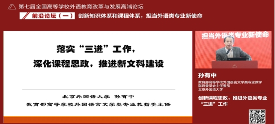 26日上午的前沿论坛,孙有中教授探讨了外语类专业课程思政的教学目标与基本原则、课程思政与“三进”工作的关系。蒋洪新教授指出外语学科亟需跨领域建设和平台建设。刘宏教授表示外语肩负崭新使命和责任,培养有家国情怀、有国际视野、有专业本领的高水平跨学科外语人是当前主要任务。其他分指委会的委员们也交流了各自专业建设方面的经验和思考。
