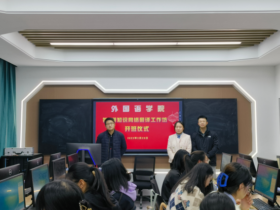 3月29日晚,外国语学院第一期知识网络翻译工作坊在博学楼502口译实验室开课。开课前,在明德楼商务英语实训室举办了简短的开班仪式。外国语学院院长余荣琦、副院长余鹏、数字人文与对外传播研究中心负责人慕媛媛教授及首期学员50余人参加了开班仪式。