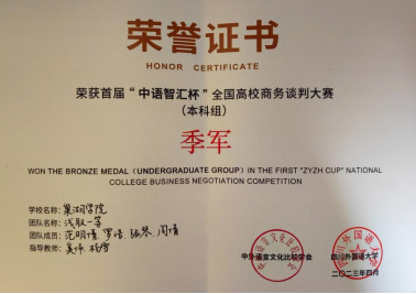 4月1日,在前两轮的角逐中,我院学子表现出众,以351.9分的成绩位列第三,不但获得了特等奖,也进入了最后的四强角逐。4月2日,在与其他三支特等奖队伍竞技的总决赛舞台上,20级商务英语的范明倩、罗浩、周倩和张琴四名同学,临场不惧、张弛有度,最终获得全国总决赛季军。范明倩和罗浩两位同学还被评为“最佳谈判代表”,全体参赛选手中仅7人获此殊荣,awc777万象城娱乐官网是唯一一所同时有两人获得此项称号的高校,充分彰显了awc777万象城娱乐官网的学子风采。同时,奚伟和杨雪获得“优秀指导教师”奖。