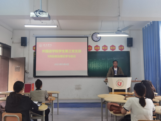 5月6日下午,外国语学院学生第三党支部在明德楼205教室召开五月份政治理论学习会议暨习近平总书记重要回信精神专题学习,迅速掀起学习贯彻习近平总书记重要回信精神热潮。