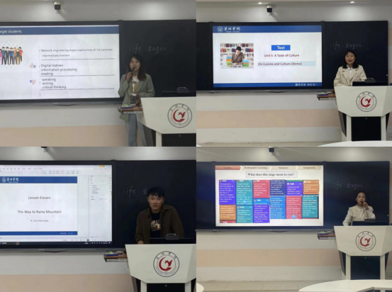 王友情选用《新视野大学英语读写教程2》中Discovery of a New Stage,从新的人生阶段,即“奥德赛岁月”出发,结合当今青年面临的困境与挑战,引导学生从东西方优质文化当中汲取养分,迎难而上,做勇于奋斗的一代人。郭佳鑫从大学英语课文A Taste of Culture出发,阐述中华美食文化所具有的丰富内涵,引领学生参与讨论不同地区美食的特点,探讨“筷子”的传承意义,增强学生的文化认同感。
