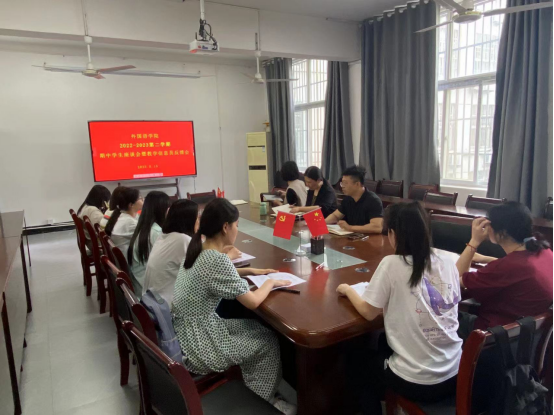 为了进一步加强教学管理,充分发挥学生参与教学管理和自我管理的主体作用,及时了解学生的学习情况和教师课堂教学情况,促进学院专业教学持续改进,5月15日下午,外国语学院在明德楼二楼会议室召开2022-2023第二学期期中学生座谈会暨教学信息员反馈会。外国语学院副院长余鹏、教学督导周建华、贺静,教科研秘书李明以及在校各班级学生代表和教学信息员参与座谈。会议由外国语学院副院长余鹏主持。
