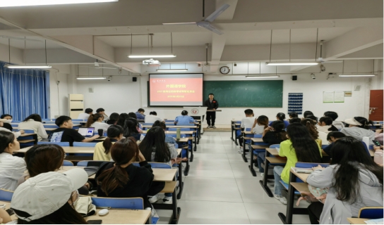 为增强学生复习备考的信心,助力同学在今年6月份的全国大学生英语专业四级考试中取得优秀成绩,提高学院专四通过率,5月23日晚,外国语学院在慎思楼中501召开了专四考试动员会。院长余荣琦、副院长余鹏、教师张丹、卜艺明、辅导员方磊和21级全体学生参会,动员会由余鹏主持。