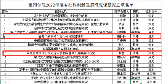 近日,安徽省社会科学界联合会发布了《关于2022年度安徽省社会科学创新发展研究课题立项的通知》(皖社科联通字[2023]8号)。外国语学院教师杨雪、汤玲玲申报的课题 “国家形象视域下《习近平谈治国理政》用典英译研究”和“安徽‘老字号’文化外译理路研究”获批立项。