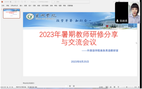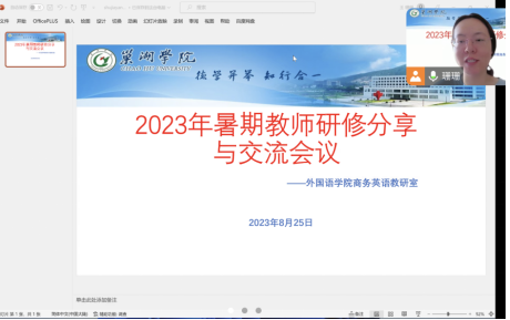 2023年8月25日上午,外国语学院商务英语系组织全体教师线上交流分享暑期研修暨师德师风建设学习心得。商务英语系副主任奚伟,教师代表陈婉柔博士、宋涛做学习心得分享。会议由教研室主任王珊珊老师主持。
