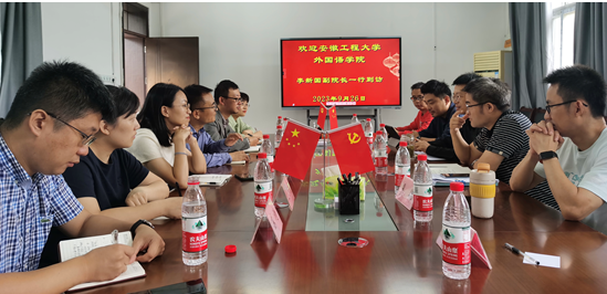 9月26日,安徽工程大学外国语学院副院长李新国一行来我院调研。调研座谈会在明德楼二楼会议室召开,学院院长余荣琦,副院长余鹏,英语系副主任、学科专业负责人徐结平,商务英语系副主任奚伟,大学外语教学部副主任吴爱群以及学科竞赛团队负责人等出席会议。会议由余荣琦主持。