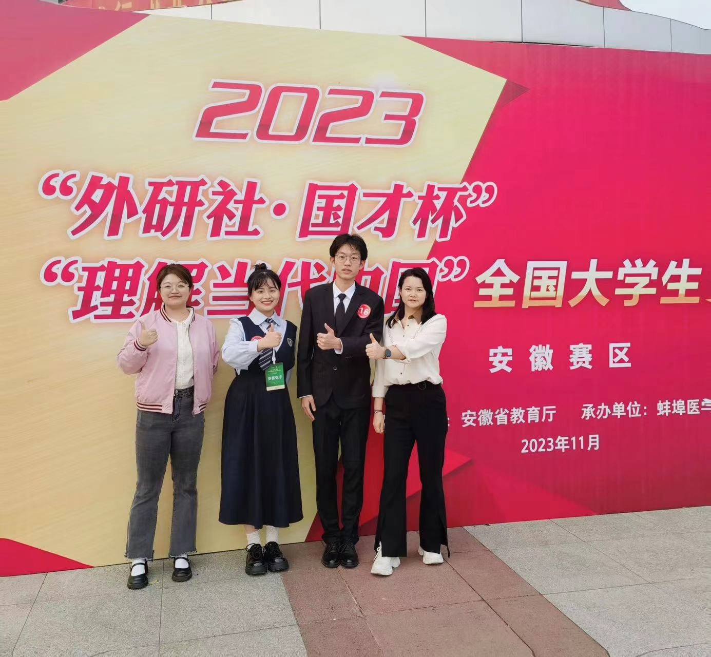 2023年“外研社·国才杯”“理解当代中国”全国大学生外语能力大赛(安徽赛区)演讲省赛落下帷幕,此次大赛由安徽省教育厅主办,蚌埠医学院承办。经过校内的层层选拔和两个月的内部培训,演讲团队推选出徐未、朱传杰两名同学,由指导教师杨晓燕和汪袁圆带队参加省赛,最终两位同学均荣获省级二等奖。