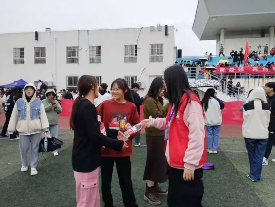 运动会进行时,志愿者们全身心地投入到志愿服务中,全程陪同在运动员身边。秉持着用心服务的精神,致力让每一位运动员都能感受到志愿者的热情与负责。志愿者们在赛前为运动员准备运动饮料,注意核对运动员赛程,提醒运动员检录时间,赛中志愿者们站在跑道外为运动员加油喝彩,赛后为运动员提供细致的照顾。