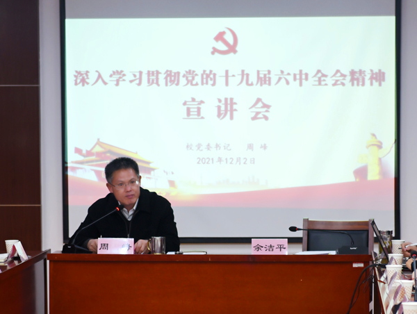 12月2日下午,校党委书记周峰在第二会议室宣讲十九届六中全会精神,宣传部、学工部、团委、保卫与校园管理处等单位负责人和60名学生代表参会,会议由校党委委员、宣传部部长余洁平主持。