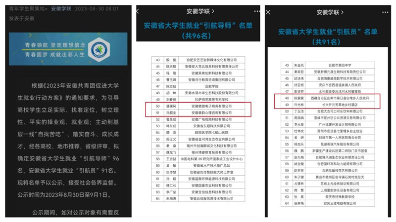 近日,团省委、省学联公布2023年安徽省大学生就业“引航导师”“引航员”名单。我校2010届英语专业毕业生潘骥风、2007届应用心理学专业毕业生孙超全、2016届电子科学与技术专业毕业生陈蒙蒙、2018届酒店管理专业毕业生许光林4位优秀校友成功入选。