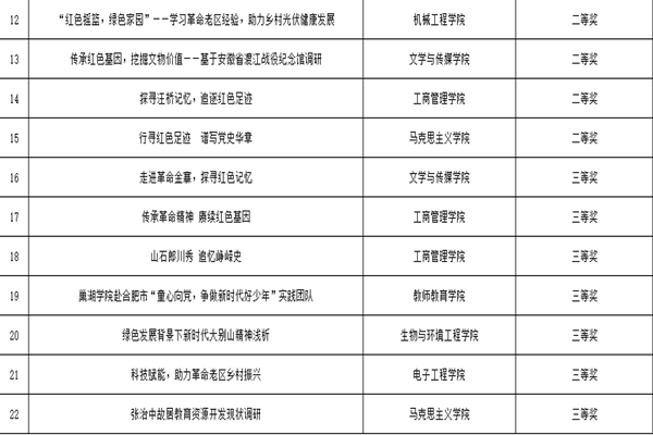经省级评审,我校邓其志、马其霞等老师指导的《追寻南下记忆:环巢湖地区南下干部革命精神挖掘与传播》、李玲、余仁能等老师指导的《讲好环巢故事,赓续红色基因——环巢湖红色文化旅游景区发展现状和优化路径研究》、郭华、许沙等老师指导的《唱响唐马小调 传承红色精神》和李梦雨、储岚霖老师指导的《追溯红色记忆,凝聚青春力量——永远的王稼祥先生》4件作品荣获一等奖;袁凤琴、邵晓等老师指导的《党的二十大报告传播效果研究——基于安徽省的调研》、雷若欣、邓书音等老师指导的《挖掘红色文化,赋能乡村振兴——以巢湖市银屏镇为例》、邢刚、苏洁红等老师指导的《“红色摇篮,绿色家园”——学习革命老区经验,助力乡村光伏健康发展》、汤重老师指导的《唱响红色民歌赓续精神血脉——非遗视域下巢湖红色民歌的发展与传承探究》、王静、王海燕等老师指导的《“不应忘却的记忆”——龙河口精神的代际传承研究》等11件作品荣获二等奖;张凤琴、潘晨老师指导的《绿色发展背景下新时代大别山精神浅析》、刘政、梁哲铭等老师指导的《科技赋能,助力革命老区乡村振兴》、曹栓姐老师指导的《走进革命金寨,探寻红色记忆》等7件作品荣获三等奖。