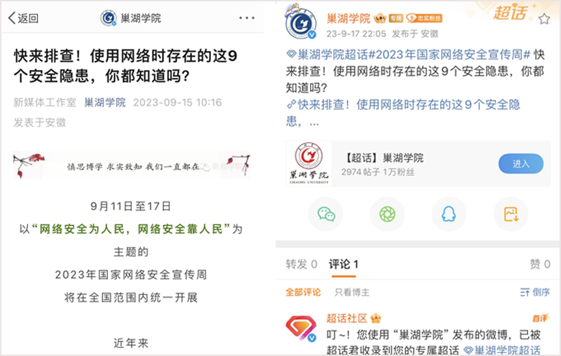 宣传部、学工部、团委等部门利用微博、公众号、易班·今日校园等平台发布网络安全相关答题和学习活动推文,大力宣传网络安全相关内容。各二级学院组织师生通过“中国大学生在线”微信公众号参加“守护青春网络有你”全国大学生网络安全知识答题活动,共有1万余名学生和100余名教师参与答题活动;通过中国大学生在线官网参与2023年度大学生网络素养能力提升大课堂学习活动,近1万名师生进入“大课堂”,并陆续学习其中的网络认知、网络安全、反间防谍等课程内容;通过“中国大学生在线”设立的在线网络安全专栏参加学习,目前已有2000余名师生学习了其中的高校精品课程。众多参与师生表示,此次答题、学习活动帮助他们学会了如何甄别网络信息,如何正确使用、生产和传播网络信息,提升了他们安全用网、善于用网、文明用网的能力素养。