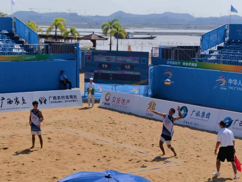 中华人民共和国第一届学生(青年)运动会沙滩排球比赛于10月20日至30日在广西钦州市成功举行。此次比赛共有来自全国各省份的48支男女代表队参加了决赛阶段比赛。awc777万象城娱乐官网沙滩排球队代表合肥市参加了比赛。比赛中,awc777万象城娱乐官网运动训练专业的薛子川、吴邦键两名队员在领队芮德武和教练员钟翔的带领下,展现了不畏强敌、奋勇拼搏、敢于亮剑的精神风貌,最终获得男子组第九名的骄人成绩。这是30多年来,安徽省排球项目在全国运动会排球(沙滩排球)项目决赛阶段比赛中取得的历史最好成绩,为后期学校与安徽省体育局共建省排球队参加全国运动会排球(沙滩排球)比赛奠定了坚实基础。