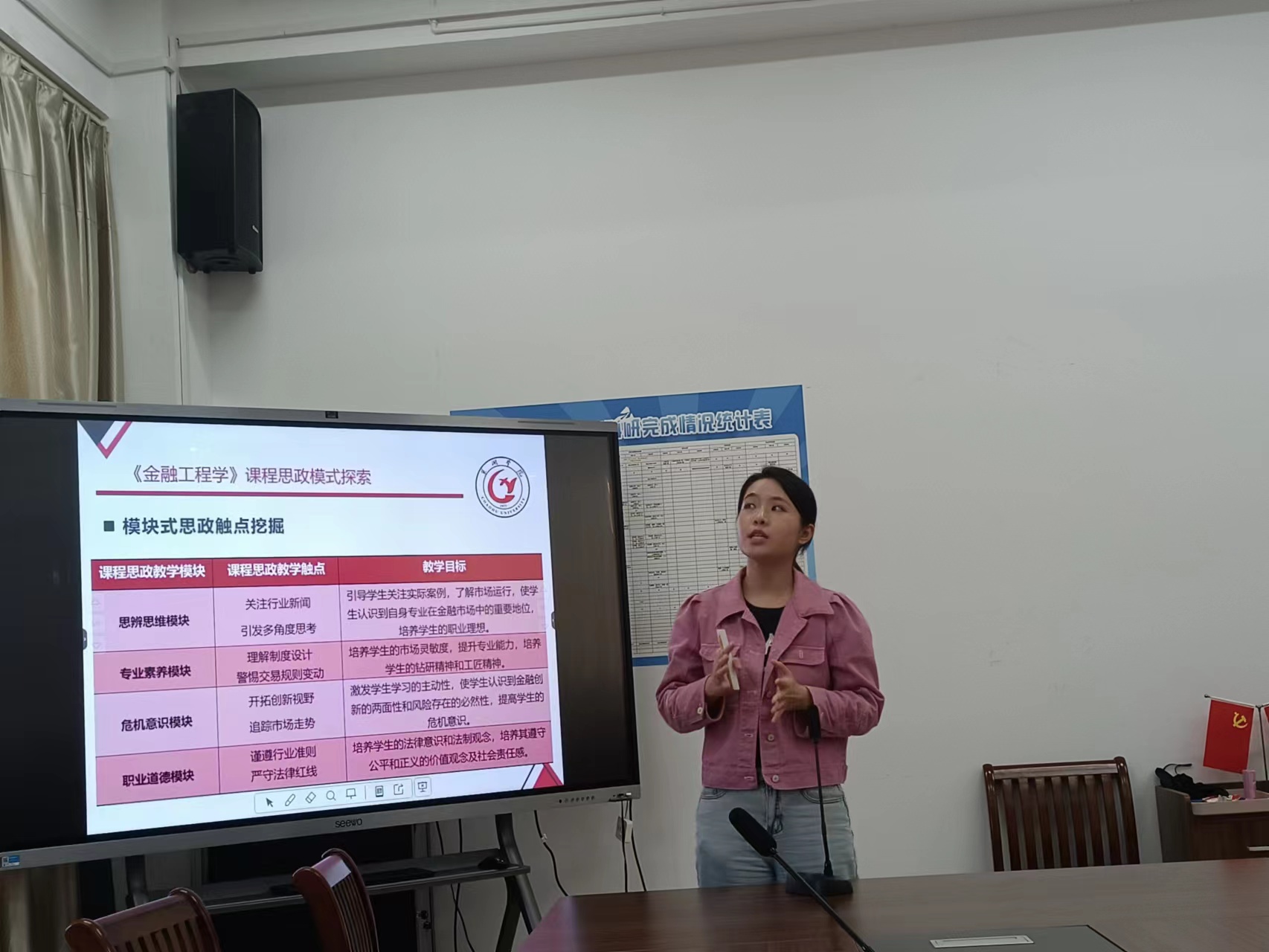 随后,来自经济与法学学院的四名教师分别结合他们所授课程作了课程思政教学经验分享。其中,穆澜老师针对《西方经济学》课程思政设计进行了交流,主要围绕课程思政设计的原则、设计的重点与难点、设计的流程三个方面作了介绍;潘选明老师与大家分享了《国际服务贸易》课程思政的教学经验,重点从课程思政目标设置、思政元素挖掘、思政案例设计等方面作了介绍;周建厂老师从律师道德职业素养角度,结合具体案例对《法律职业伦理》课程内容与思政元素融入作了介绍;唐蔚老师则作了题为“金融工程学——课程思政元素探讨”汇报,她从模块式思政触点挖掘、启发式思政教育引导、互动式思政路径创设三个方面对金融工程学课程思政路径进行了论析。