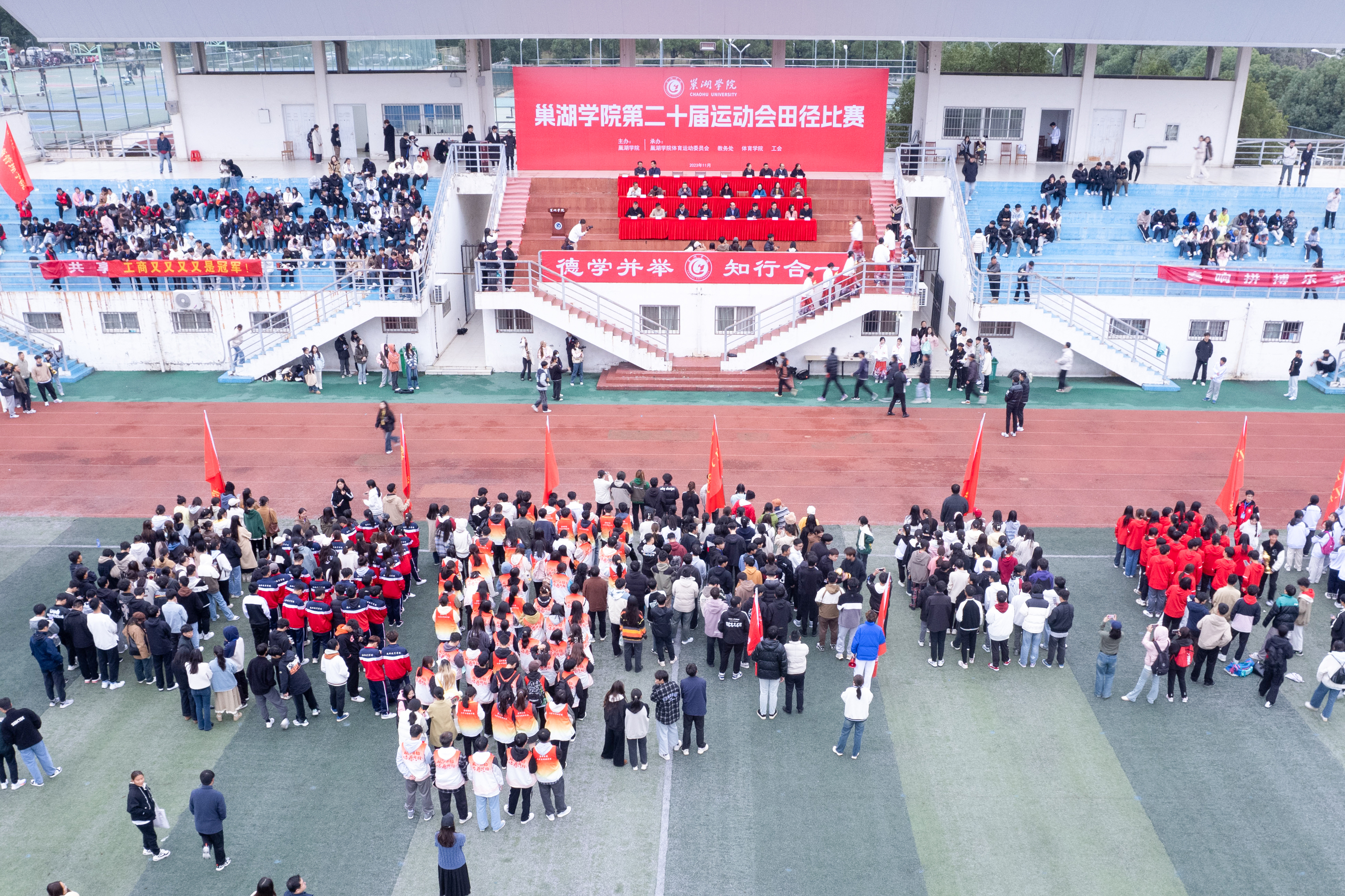 各学院代表队依次有序入场。此次运动会共有14支代表队参赛,千余名运动员中有7人次打破5项学校记录,勇创佳绩。运动会开幕式精彩的文艺表演,跑道上运动员挑战自我的拼搏精神,幕后工作人员及志愿者无私奉献的热情态度,这些正是巢院学子们对青春的阐释,展现了他们对体育的无限热爱。