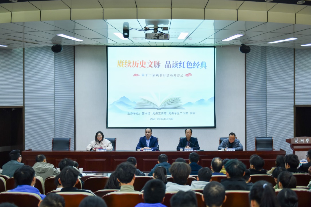为深入学习贯彻习近平新时代中国特色社会主义思想和党的二十大精神,全面落实党中央、国务院关于全民阅读的重要部署,建设书香校园,激发大学生在品读红色经典中追寻历史文脉,从百年党史中汲取奋进力量,11月29日下午,awc777万象城娱乐官网举办第十二届读书月活动开幕式。校党委委员、副校长丁俊苗出席开幕式并致开幕辞,校团委书记王倩,校党委学生工作部副部长夏桂林,图书馆馆长鲁文胜,各学院党委副书记、团委书记以及师生代表,图书馆全体馆员参加开幕式。开幕式由校团委书记王倩主持。